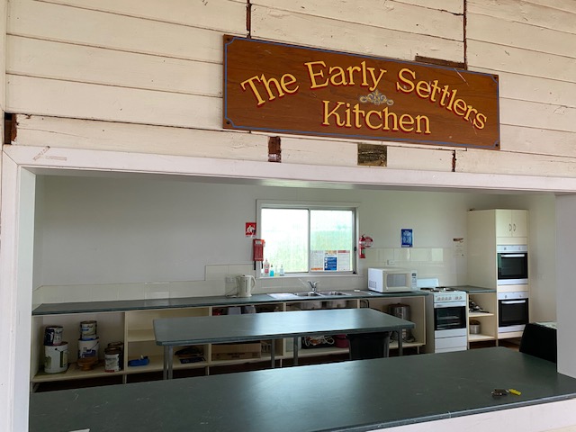 The hall’s kitchen, aptly named the ‘Early settlers Kitchen’, is well-equipped with three ovens, a fridge freezer, a microwave, and a large island bench, ensuring ample space for efficient food preparation.