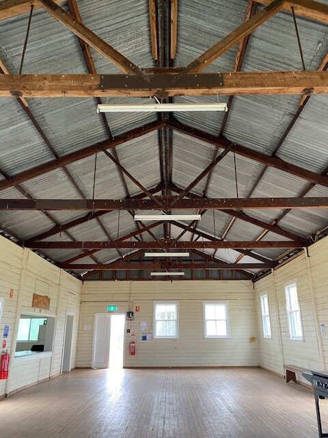 Inside Settlement Hall, the wooden floorboards and structural beams exude a timeless character, complemented by onsite equipment such as long tables and wooden benches, allowing for varied seating arrangements and layout.